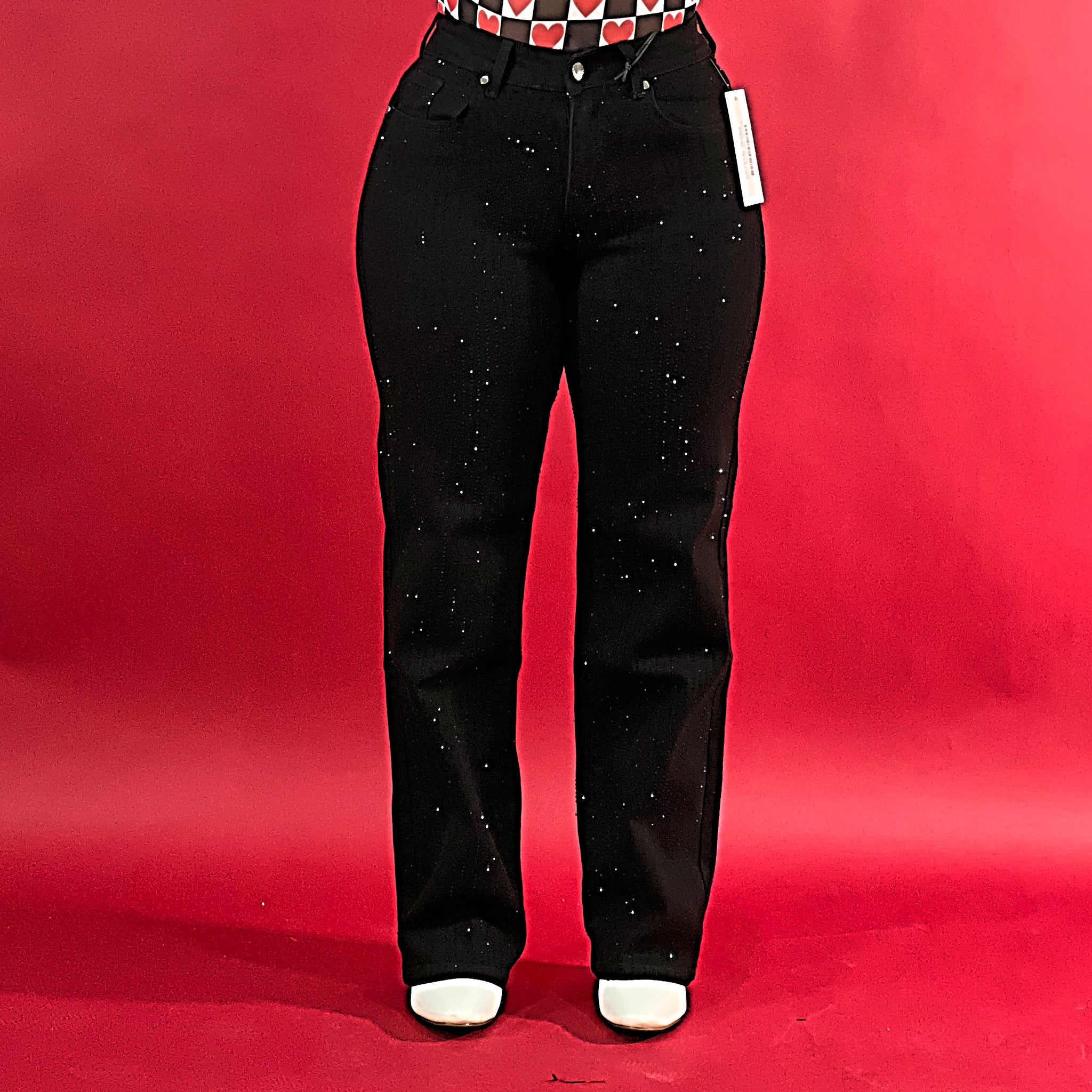 Black rhinestone jeans embellished in the front of Jean and in the back jeans pockets