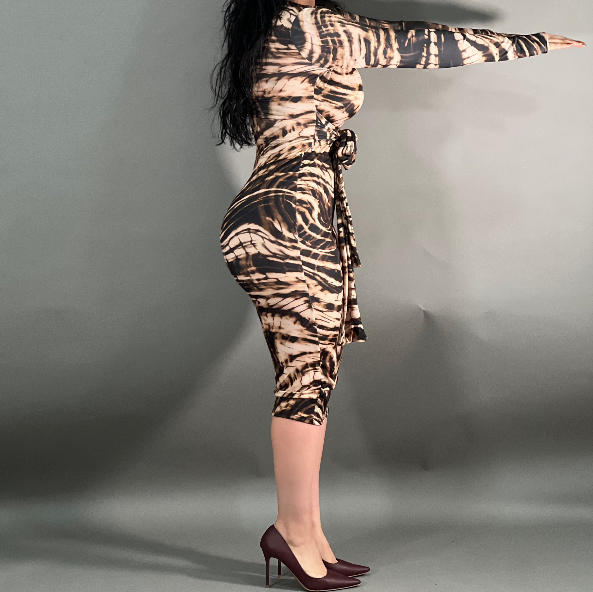 Animal print l/s stretchy midi dress with snatch tie sash detail