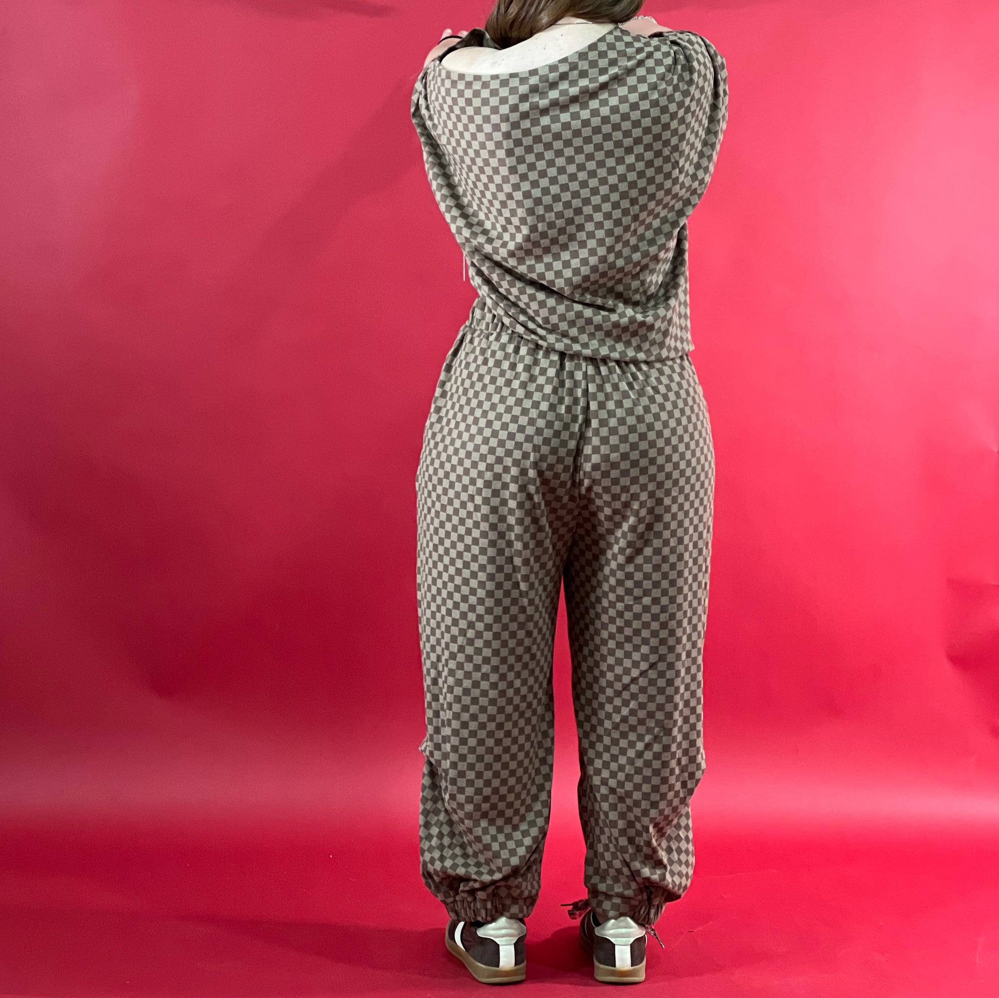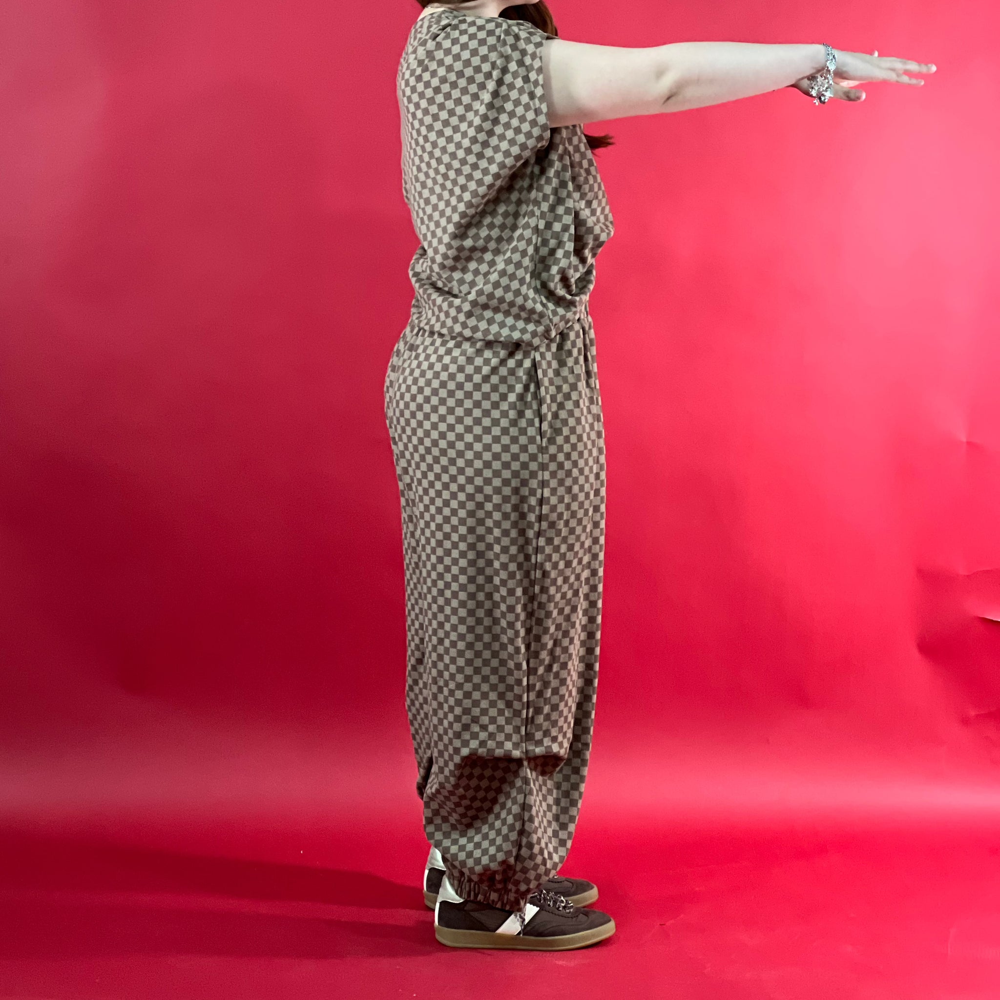 Soft material checkered print harem pants and draped top